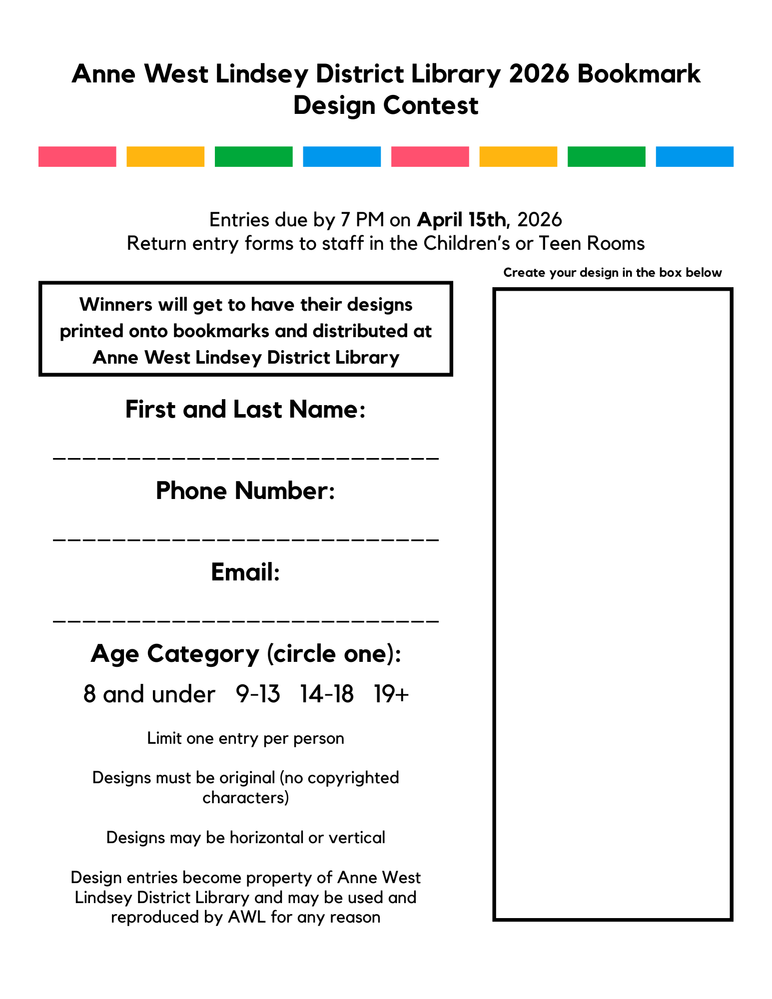 - Design entries become property of Anne West Lindsey District Library and may be used and reproduced by AWL for any reason